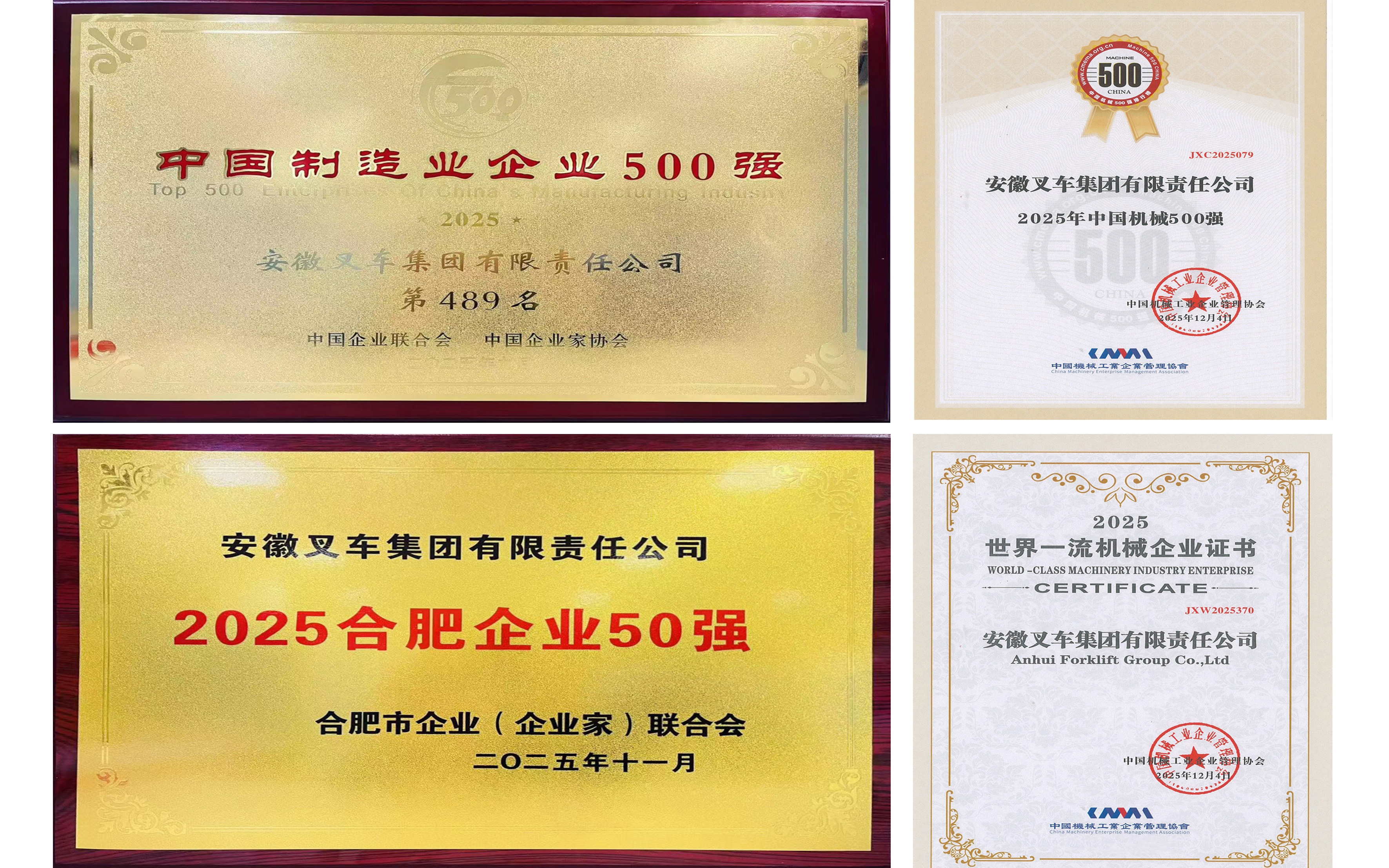 自2000年以来,合力累计获得科技进步奖70余项,其中安徽省科技进步奖20余项(一等奖4项)。 合力拥有国家级企业技术中心和国家级工业设计中心,入选“创建世界一流专精特新示范企业”“国家制造业单项冠军示范企业”名单,荣获“全国供应链创新与应用示范企业”称号等。
